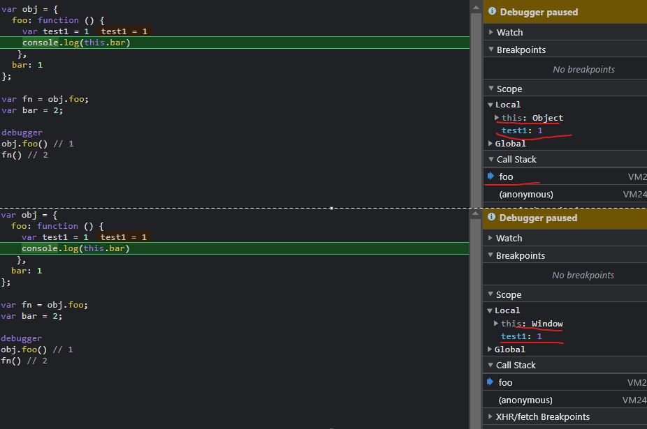 - 对于 foo()来说,foo 运行在全局环境,所以 this 指向全局环境。所以,两者的运行结果不一样。