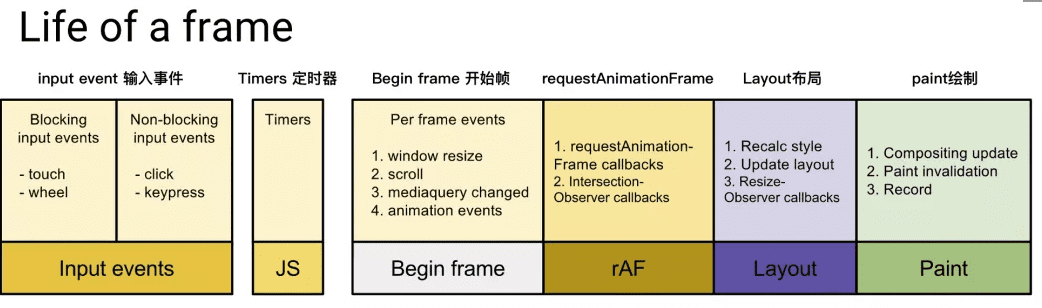 在浏览器中,页面是一帧一帧绘制出来的,渲染的帧率与设备的刷新率保持一致。