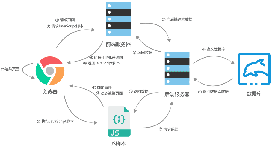 请求完成后,前端服务器会组装一个携带了具体数据的HTML文本,并且返回给浏览器,浏览器得到HTML之后开始渲染页面,同时,浏览器加载并执行 JavaScript 脚本,给页面上的元素绑定事件,让页面变得可交互,当用户与浏览器页面进行交互,如跳转到下一个页面时,浏览器会执行 JavaScript 脚本,向后端服务器请求数据,获取完数据之后再次执行 JavaScript 代码动态渲染页面。