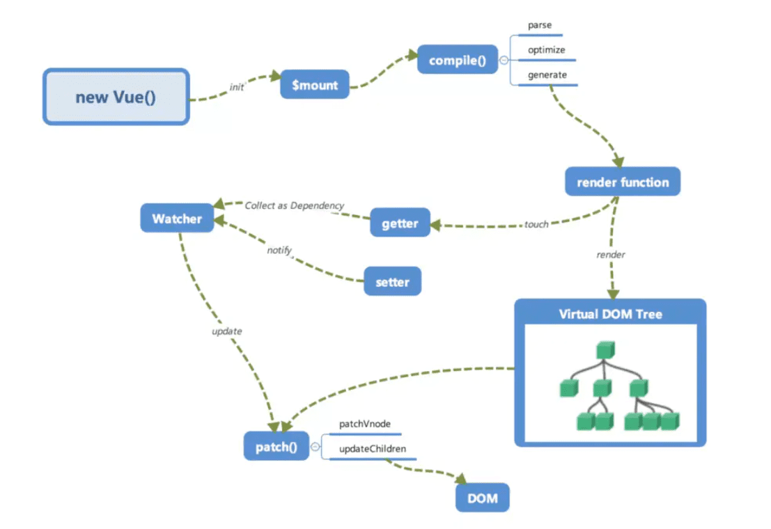 解析器Compile从而更新视图。解析器Compile,可以扫描和解析每个节点的相关指令(v-model,v-on等指令),如果节点存在v-model,v-on等指令,则解析器Compile初始化这类节点的模板数据,使之可以显示在视图上,然后将相关指令(如v-model,v-on)对应初始化成一个订阅者Watcher,并替换模板数据或者绑定相应的函数,此时当订阅者Watcher接收到相应属性的变化,执行updateComponent方法(异步),通过vm._render()更新vNode(新旧node对比),最后渲染到html中