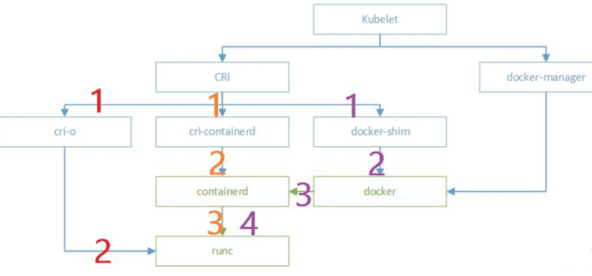 下图中的紫、橙、红三种颜色,代表了 dockershim、cri-containerd、cri-o 三种 CRI 的典型方式——流程在逐渐缩短,这也是 CRI 实现的一个演进过程。