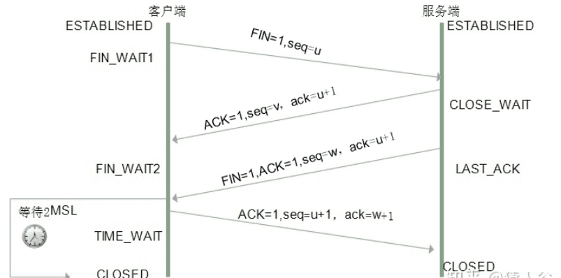 LAST_ACK的状态。 即服务端没有要向客户端发出的数据,服务端发出连接释放报文段(FIN=1,ACK=1,序号seq=w,确认号ack=u+1),服务端进入LAST_ACK(最后确认)状态,等待客户端的确认。 - 第四次挥手:客户端收到 FIN 之后,一样发送一个 ACK 报文作为应答,且把服务端的序列号值 +1 作为自己 ACK 报文的序列号值,此时客户端处于