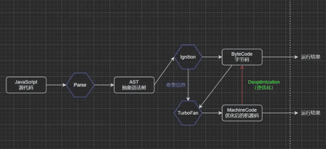 图中还存在一个Deoptimization过程,其实就是机器码被还原成ByteCode,比如,在后续执行代码的过程中传入热点函数的参数类型发生了变化(如果给sum函数传入number类型的参数,那么就是做加法;如果给sum函数传入String类型的参数,那么就是做字符串拼接),可能之前优化的机器码就不能满足需求了,就会逆向转成字节码,字节码再编译成正确的机器码进行执行;
