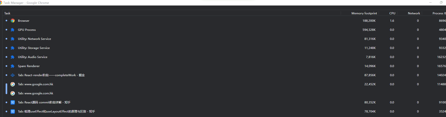 注意:Chrome 还为我们提供了「任务管理器」,供我们方便的查看当前浏览器中运行的所有进程及每个进程占用的系统资源,右键单击还可以查看更多类别信息。 通过「页面右上角的三个点点点 --- 更多工具 --- 任务管理器」即可打开相关面板,